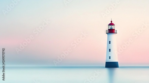 A beacon of light, standing tall amidst a tranquil sea, its vibrant colors reflecting off the surrounding waves The sky above, a soft shade of pink, accentu