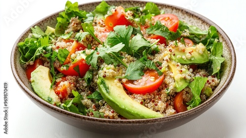 A bowl of salad featuring tomatoes, avocado, lettuce on a white surface