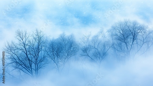 A cluster of leafless trees in a misty, foggy scene, backed by a blue sky dotted with clouds