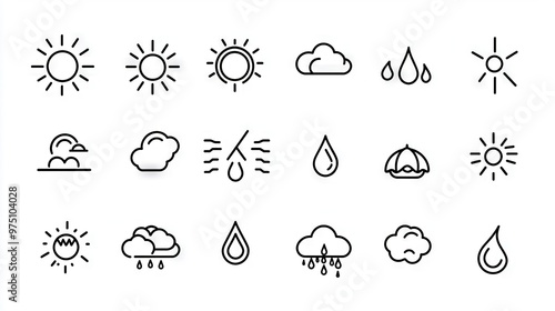 A collection of weather symbols in monochrome, featuring rain, sun, cloud, and droplets