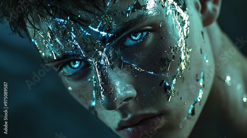 A detailed portrait of a male face, submerged in water and adorned with shimmering light