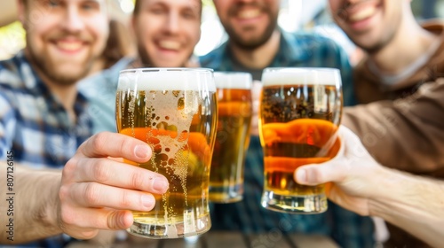 A group of men raise mugs of beer, toasting in front of a worn wooden table Oranges rest atop the glass rims below