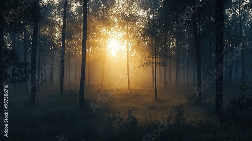 A hazy, tree-lined park with tall grass in the foreground is illuminated by the sun