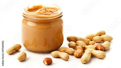 A jar of peanut butter beside a mound of nuts on a white background, with a spoon inside