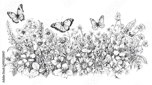A monochrome illustration depicts a field of blossoms, with two butterflies soaring above The lower portion of the image remains in grayscale