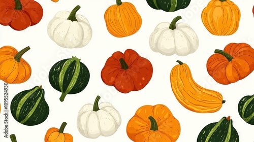 A patterned display of pumpkins and gourds on a white canvas, adorned with green, orange, and white stripes