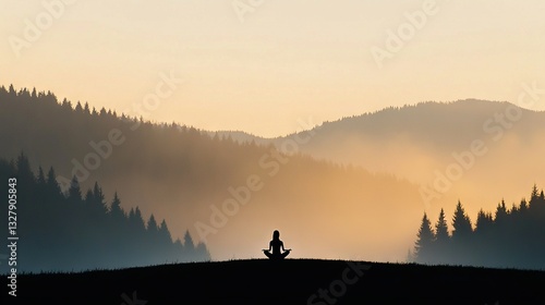 A person sitting in a yoga pose atop a hill amidst a dense forest, with a majestic mountain in the backdrop