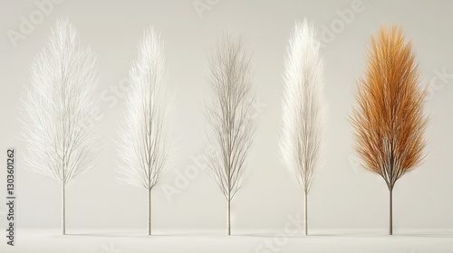 A quartet of lofty, white-and-orange trees reside in a pristine white chamber, surrounded by pristine white walls In the backdrop is a pr