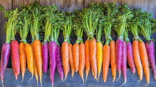 A row of carrots is aligned against a wooden wall, with additional carrots lining the opposite side