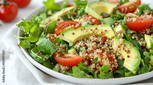 A salad with tomatoes, avocado, lettuce, and quinoa on a white plate