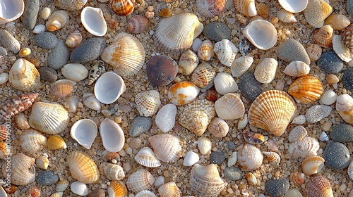 A sandy beach with blue skies, dotted with seashells scattered on the shore