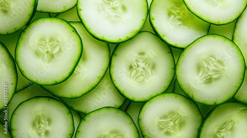 A stack of cut cucumbers atop a mound of overlapping cucumbers