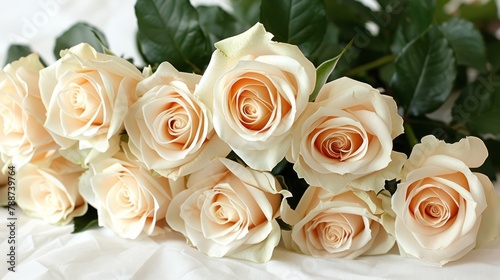 A table is adorned with a white tablecloth and several bunches of white roses, each accompanied by green leaves