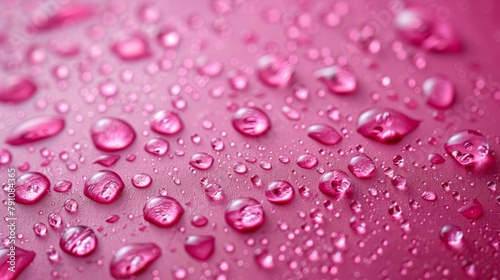 A tight shot of water droplets on a pink substrate, reflecting softly in their surfaces