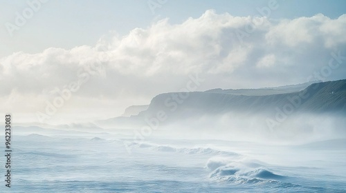 A vast expanse of water, with rolling waves crashing onto the coastline and a rugged cliff standing tall on the opposite shore