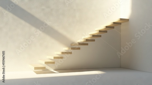 A white room with a set of stairs bathed in sunlight streaming through the window, casting a shadow onto the walls