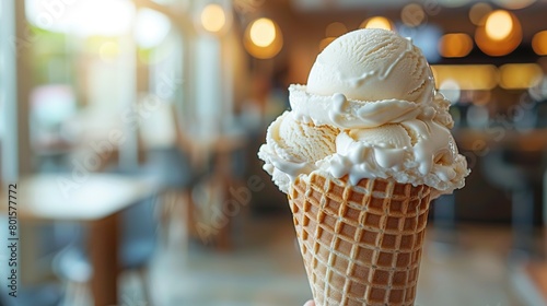 An ice cream cone held by a hand, featuring a scoop of cream on top against a blurred background