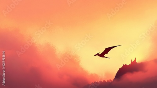Bird soaring above sunset, cloudy background