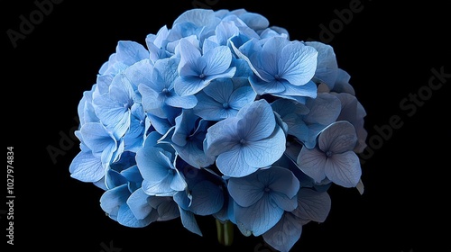Close-up of a blue hydrangea against a dark background with a blurred image of the hydrangea