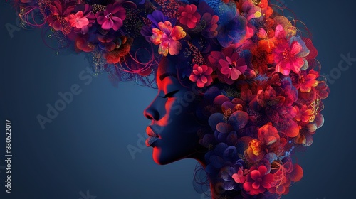 Close-up portrait of a woman with a blooming floral crown against a serene blue backdrop featuring an array of colorful blossoms