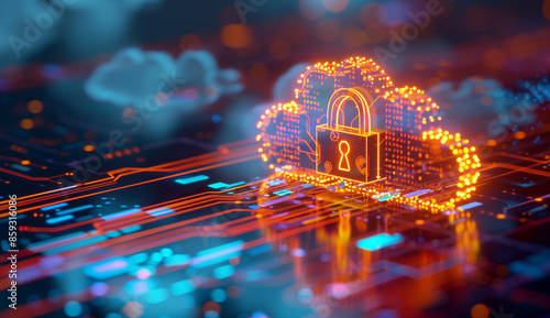 クラウドセキュリティのアイデアをロックシンボルで表現したコンセプト、テクノロジー、 デジタル ,Generative AI、Concept, Technology, Digital ,Generative AI that represents the idea of cloud security with rock symbols,