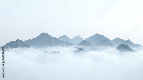 Group of mountains shrouded in misty sky; airplane soaring mid-frame