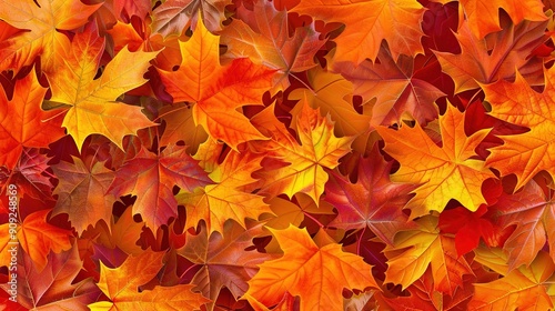 Orange and red leaves pile up on a red, yellow, and orange-leafed wall