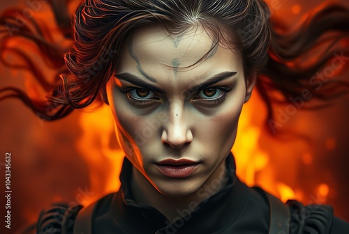 Pyropexia A fiery woman with a face that is set in a fierce re