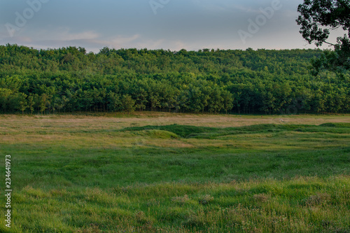 Rural landscape. A hill with trees on the horizon and in front of it a green field in a summer day