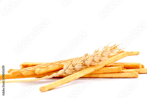salty sticks an wheat ears on white background