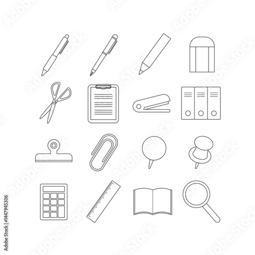 シンプルな文房具のベクターイラスト:オフィスと学習のためのアイコン集 - Simple Stationery Vector Illustration: Line Icons for Office and Learning