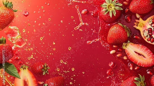 Strawberries and pomegranates are mixed together on a red background