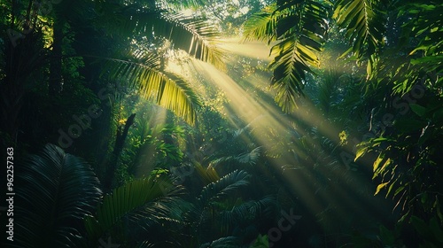 Sun shining through tree leaves in tropical forest appears as if in jungle center