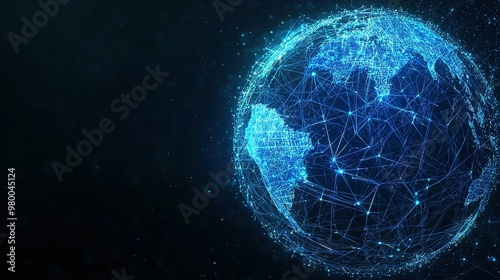 The Earth appears as a dark-colored sphere with a network of lines and dots surrounding it on a black background