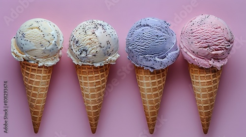 Three cones of ice cream line up in a row on a pink backdrop, each featuring distinct flavors