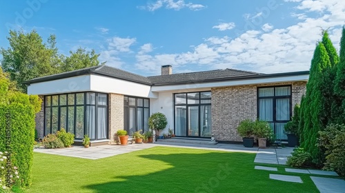 A beautiful detached house with a modern design, surrounded by a well-maintained garden, captured in natural daylight