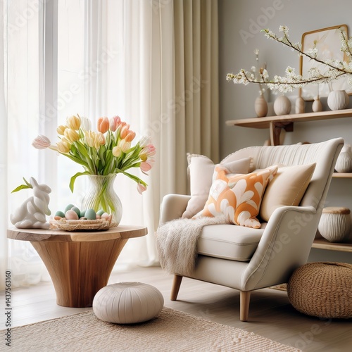 A beautifully designed spring themed living room interior featuring a stylish modern armchair