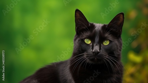 a black cat with green eyes looking at the camera with a blurry background. generative ai