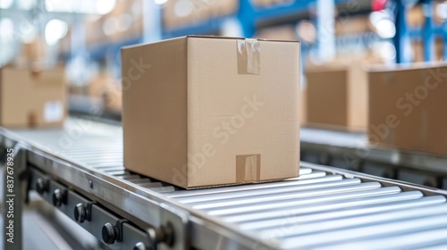 A cardboard box atop a conveyor belt in a spacious room Foreground features the conveyor belt, while boxes line the belt's background