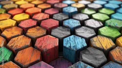 a close up of a multicolored hexagonal pattern made of wooden planks with different colors of paint on the sides of the hexagonals.