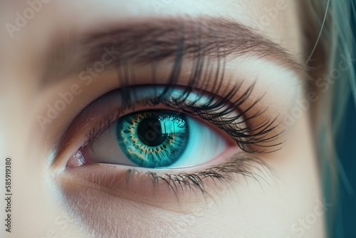 a close up of a woman's blue eye with long lashes and a green eyeliner with a green flower in the center of the iris. generative ai