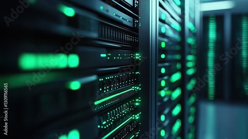 A close-up shot of the server rack in an advertising agency's data center, with glowing green lights indicating activity and ambient lighting creating depth.