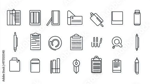 A collection of thin line icons representing various paper types, pencils, and paper clips against a white background