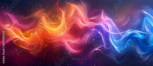 A computated image of a waving band of colored lines and stars against a backdrop of numerous celestial bodies in space