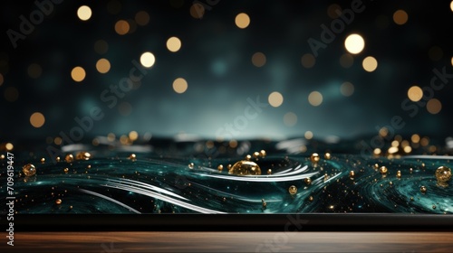 a computer screen with a blurry image of a night sky and a lot of gold lights in the background.