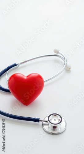 : A conceptual series of photos featuring a red heart model placed beside or on a stethoscope, symbolizing healthcare, medical treatment, cardiology, and love for life.