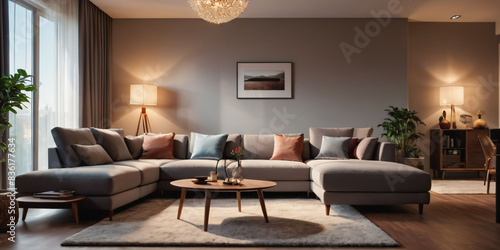 A cozy minimalist bedroom with a plush area rug, a low-profile bed with a simple headboard, and a floor lamp with a minimalist shade