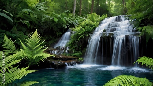 A crystal-clear waterfall cascading into a serene pool surrounded by fern
