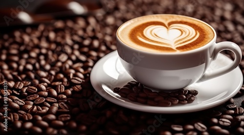 A cup of coffee with heart-shaped latte art on top, surrounded by scattered coffee beans.