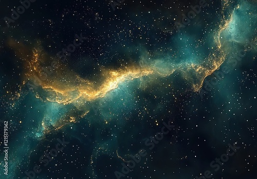 A dark teal and gold galaxy, with stars and nebulae, ethereal and iridescent